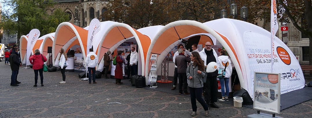 Präsentieren Sie in kombinierten Zeltstädten Ihre Ideen, Informationen, Visionen oder Produkte vor Ort in kleinen Gruppen über einen bestimmten Zeitraum. Roadshow-Zelte für Ihren Werbeauftritt.